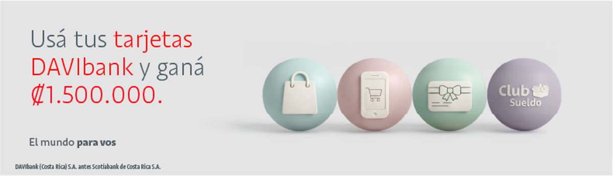 Promoción vigente del 23 de febrero al 30 de abril de 2026 y aplica únicamente para clientes de tarjeta de crédito y débito emitidas por DAVIbank (Costa Rica) S.A. (antes Scotiabank de Costa Rica S.A.) en Costa Rica o que mantengan la marca Scotiabank impresa en su plástico. Esta promoción aplica únicamente para tarjetas de crédito y débito de personas naturales. Se excluyen los productos Visa Banca Negocios. Serán 10 ganadores de ¢1,500,000 cada uno, el premio será acreditado en la tarjeta de crédito de DAVIbank del ganador. En el caso de que el ganador solamente posea una tarjeta de débito, el premio será acreditado en la cuenta bancaria ligada a dicha tarjeta de débito a nombre del ganador en DAVIbank, la cuenta bancaria debe estar activa y las tarjetas de crédito deben estar en estatus normal al momento de realizarse la acreditación del premio. Los productos y servicios obtenidos son responsabilidad única exclusiva del comercio que los ofrece. El Banco participa únicamente como medio pago, por lo no es responsable por la calidad de los servicios o productos adquiridos. En el marco de la integración de las operaciones de The Bank of Nova Scotia ("Scotiabank") en Costa Rica, Scotiabank ha otorgado una licencia de uso temporal de la marca "Scotiabank" (y sus derivados) a DAVIbank(Costa Rica) S.A. (antes Scotiabank de Costa Rica S.A.).